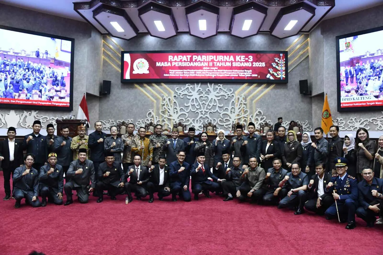 Palangka Raya, cekrek.id – Dewan Perwakilan Rakyat Daerah Provinsi Kalimantan Tengah (DPRD Kalteng) menggelar Rapat Paripurna Pengumuman Usul Pemberhentian Gubernur H Sugianto Sabran dan Wakil Gubernur H Edy Pratowo masa jabatan 2020-2024 dan Usul Pengesahan Pengangkatan Calon Gubernur dan Wakil Gubernur masa jabatan 2025-2030, Agustiar Sabran-Edy Pratowo, Sabtu (08/02/2025).